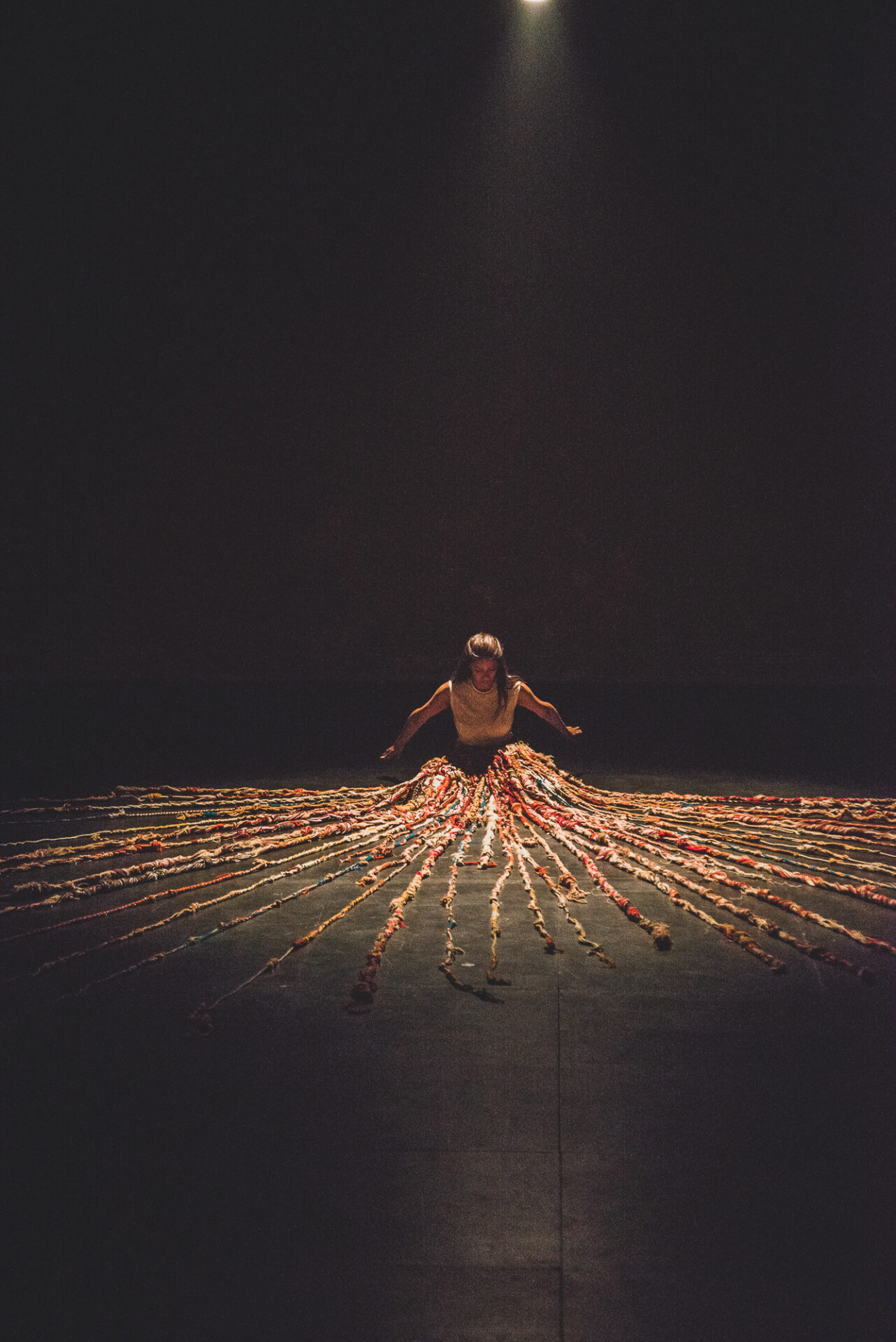 Kay s’inspire de ces échanges épistolaires pour réaliser une adaptation contemporaine qui oscille entre récit et danse, réel et virtuel. À travers un tissage d’hypertextes codifiées (chaque nœud que l’artiste fait correspond à une phrase), Lettres péruviennes cartographie les déracinements et la violence à trois moments de l’histoires, l’époque préhispanique, le XVIIIe siècle et aujourd’hui.